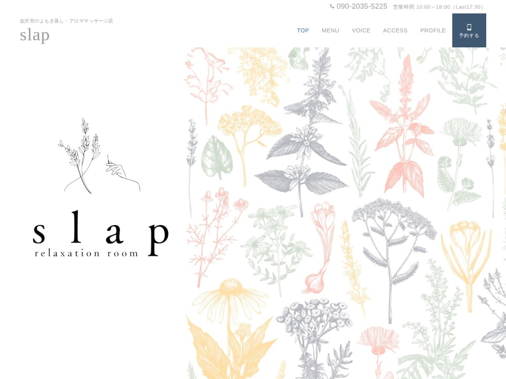 | relaxation room slap | 金沢の地元よもぎと加賀野菜のエキスを使用した独自ブレンド | 完全個室、アフターケアの充実、季節限定メニューあり |